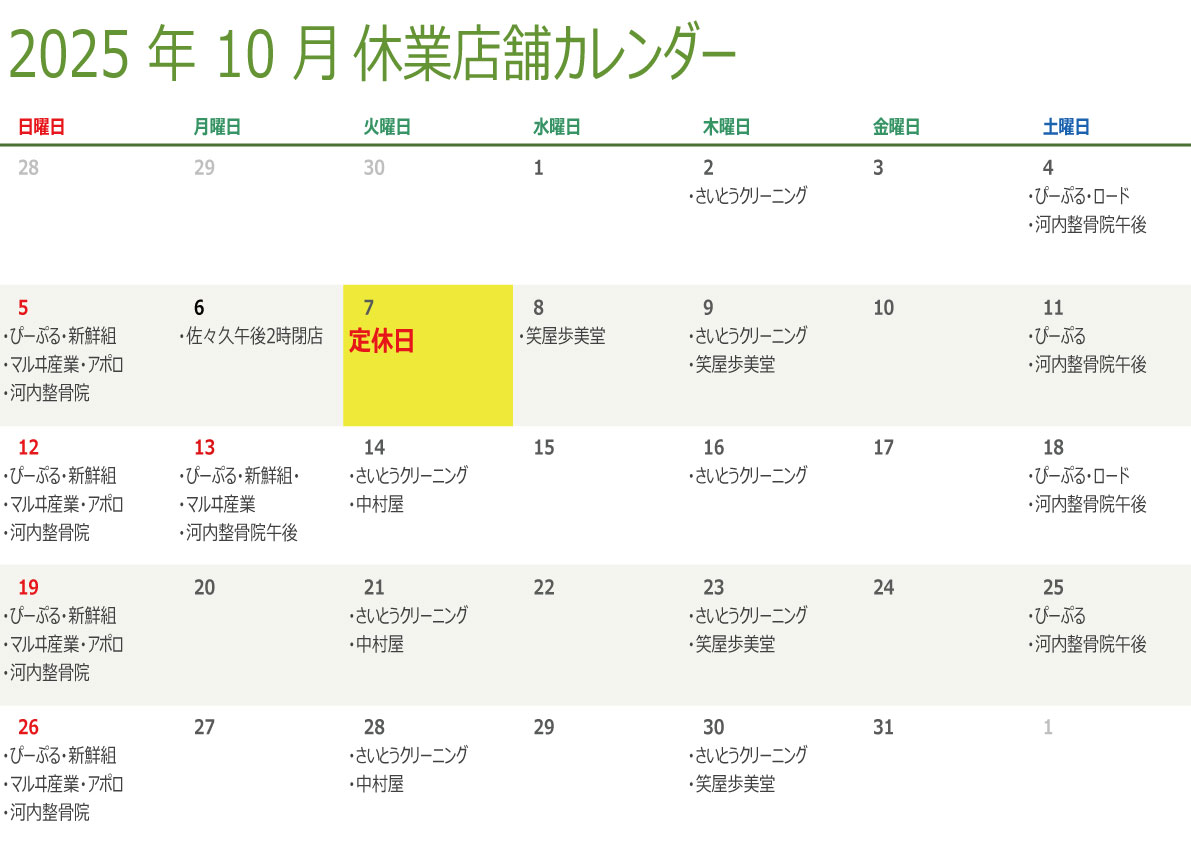 お知らせ 催事情報10月定休日催事情報 投稿者: M1更新日:2025年9月29日2025年9月30日 10月7日㈫定休日※こちらは9月29日時点の内容となります。なお、記載事項は予定につき、都合により延期または中止となる場合もございます。予めご了承ください。