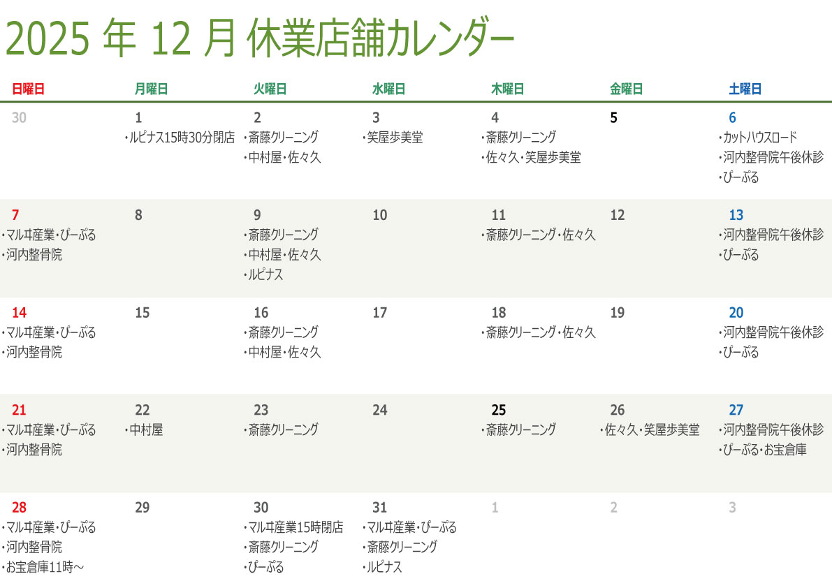 お知らせ 催事情報12月定休日催事情報更新日:2025年11月30日2025年11月30日 12月は休まず営業いたします。各店の休業日は下記の通りとなります。※こちらは11月28日時点の内容となります。なお、記載事項は予定につき、都合により延期または中止となる場合もございます。予めご了承ください。